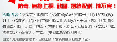 ,輸入序號即可擁有60天防毒保護;本序號沒有一次儲入多組累積時間的功能,儲入多組時,會以最後儲入的時間為起始時間計算。舉例:玩家於8/5、8/30、9/1在同一台電腦輸入序號,則以最後儲入的時間9/1起計算60天,到期日為10/30。