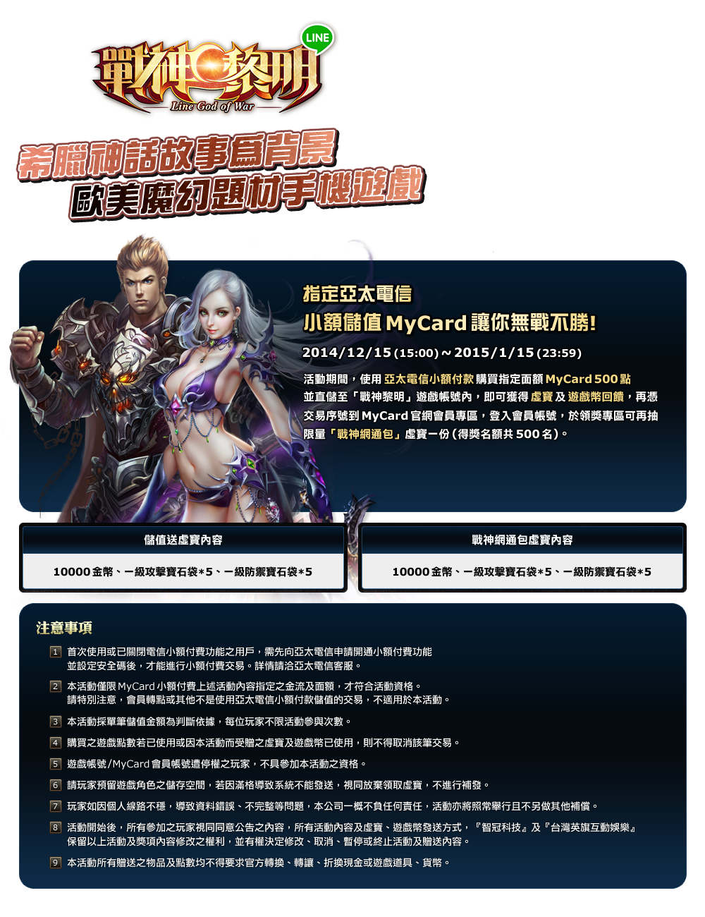 活動期間,使用亞太電信小額付款購買指定面額MyCard500點並直儲至「戰神黎明」遊戲帳號內,即可獲得虛寶及遊戲幣回饋,再憑交易序號到MyCard官網會員專區,登入會員帳號,於領獎專區可再抽限量「戰神網通包」虛寶一份(得獎名額共500名)。